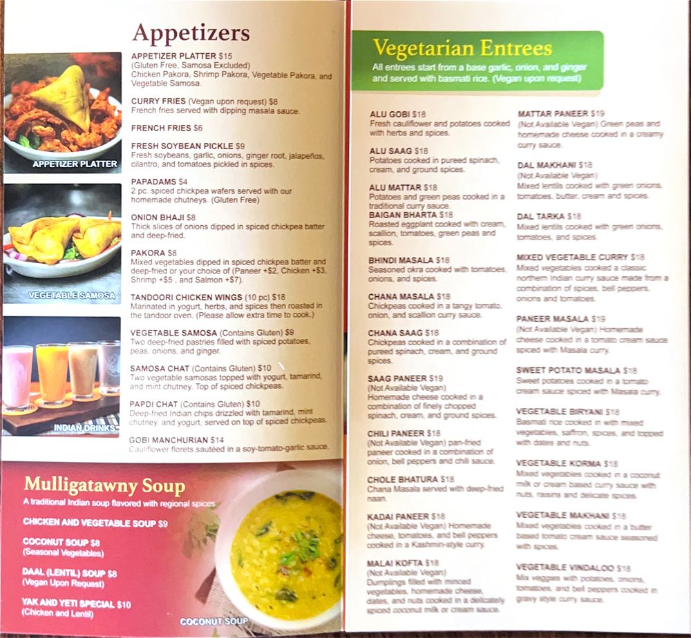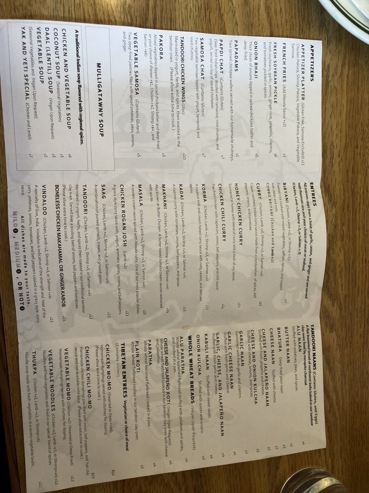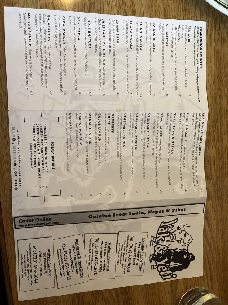 The Yak and Yeti - Westminster offers a variety of delicious dishes in a casual setting. From flavorful tandoori naans like the Alu Naan stuffed with potatoes, peas, and spices, to appetizers like the Appetizer Platter with chicken pakora, shrimp pakora, and vegetable samosa, there is something for everyone. The menu also includes Mulligatawny Soup, sides like Daal (Lentil) Soup, and a selection of sauces and pickles to enhance your meal. The outdoor seating area, full bar, and option for catering make it a great spot for groups or families. The vibrant flavors and diverse options at The Yak and Yeti - Westminster will surely leave you satisfied and craving more.